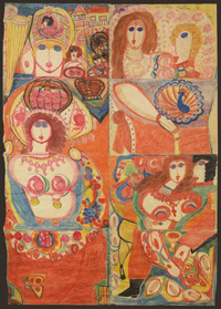 Aloise Corbaz (1886-1964) was born in Lausanne in the Swiss French Canton of Vaud. One of the most productive and important 'Outsider Art' ('Art Brut') painters, she originally wanted to be an opera singer. She studied voice and the opera repertoire but the cultural environment, education, religion as well as social life of the time prevented her from pursuing this kind of profession.